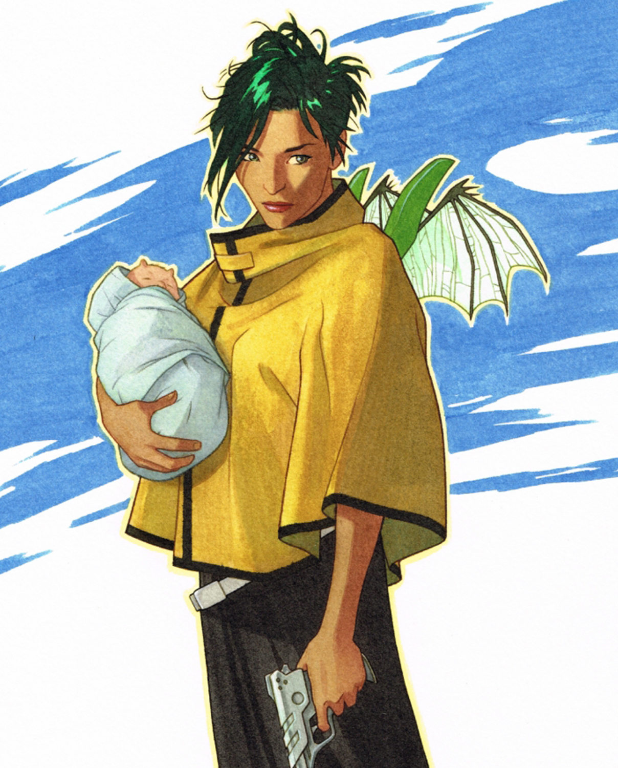The female lead of the series, Alana is Marko's wife and Hazel's mother. She is a native of the planet Landfall, and like all Landfallians she has wings,\ although her wings do not allow her to fly until issue #18.After joining her planet's war against the Wreathers (one issue says she was drafted after flunking out of state college while another says that she joined the military a few months after her father remarried Alana's childhood friend, Even), she was subsequently reprimanded for "abject cowardice" for hesitating to kill civilians and was redeployed to the planet Cleave, where as a prison guard she met Marko. She developed a friendship with him and when she learned he was to be transferred to a more brutal prison from which detainees never return, she helped him escape, just twelve hours after having met him. She later married him and gave birth to their daughter, Hazel, in the series' first issue.