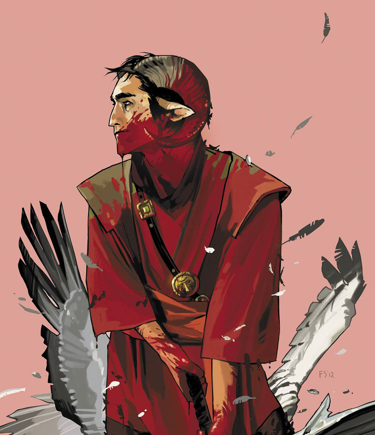 The male lead of the series, Marko is Alana's husband and Hazel's father. He is from Landfall's moon Wreath, whose people have horns or antlers and can wield magic. Marko was a foot soldier in his people's war against the Coalition of Landfall. He was raised since a young age with the knowledge of the atrocities that Landfall committed against their people. When Marko left Wreath as an adult, he was still "a gung-ho kid who just wanted to do [his] moon proud and kick some ass." This changed the first time he saw battle, after which he began to develop a less militant and more pacifist outlook. When he tried to share these misgivings with his fiancée Gwen, he realized from her unsympathetic and jingoistic responses that they had grown too far apart to continue their relationship. Marko surrendered to Coalition forces as a "conscientious objector" 18 months before the beginning of the series. He was a prisoner of war on the planet Cleave until his guard, Alana, escaped with him, married him and conceived their daughter, Hazel. Wreath High Command sent The Will after Marko because Marko "renounced his oath and betrayed The Narrative" by fraternizing with an enemy combatant. Though he is a pacifist who vows upon the birth of his daughter to never again use his sword, and dislikes the practice of owning firearms, he does so nonetheless when his family is threatened and is so skilled with a sword that he can dispatch an entire squad of enemy soldiers armed with firearms, for which he is referred to by Prince Robot IV as a "force of nature".
