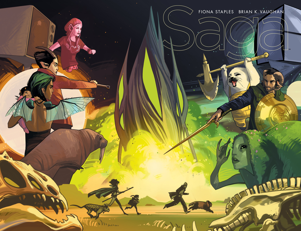 Saga is an epic space opera/fantasy comic book series written by Brian K. Vaughan and illustrated by Fiona Staples, published monthly by the American company Image Comics. The series is heavily influenced by Star Wars and is based on ideas Vaughan conceived both as a child and as a parent. It depicts a husband and wife, Alana and Marko, from long-warring extraterrestrial races, fleeing authorities from both sides of a galactic war as they struggle to care for their daughter, Hazel, who is born in the beginning of the series and who occasionally narrates the series as an unseen adult.
